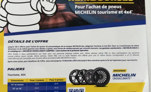 opération pneumatiques Michelin du 6 octobre 2025 au 30 novembre 2025 au garage des flots Peugeot à Palavas les flots.Jusqu'a 120€remboursés pour l'achat…